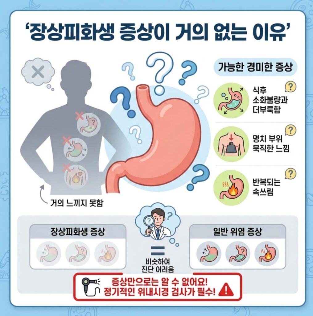 하지만 이 증상들은 일반적인 위염과 구별이 어렵습니다. 장상피화생 증상만으로는 진단이 불가능하고, 반드시 위내시경 조직검사로만 확인할 수 있습니다.