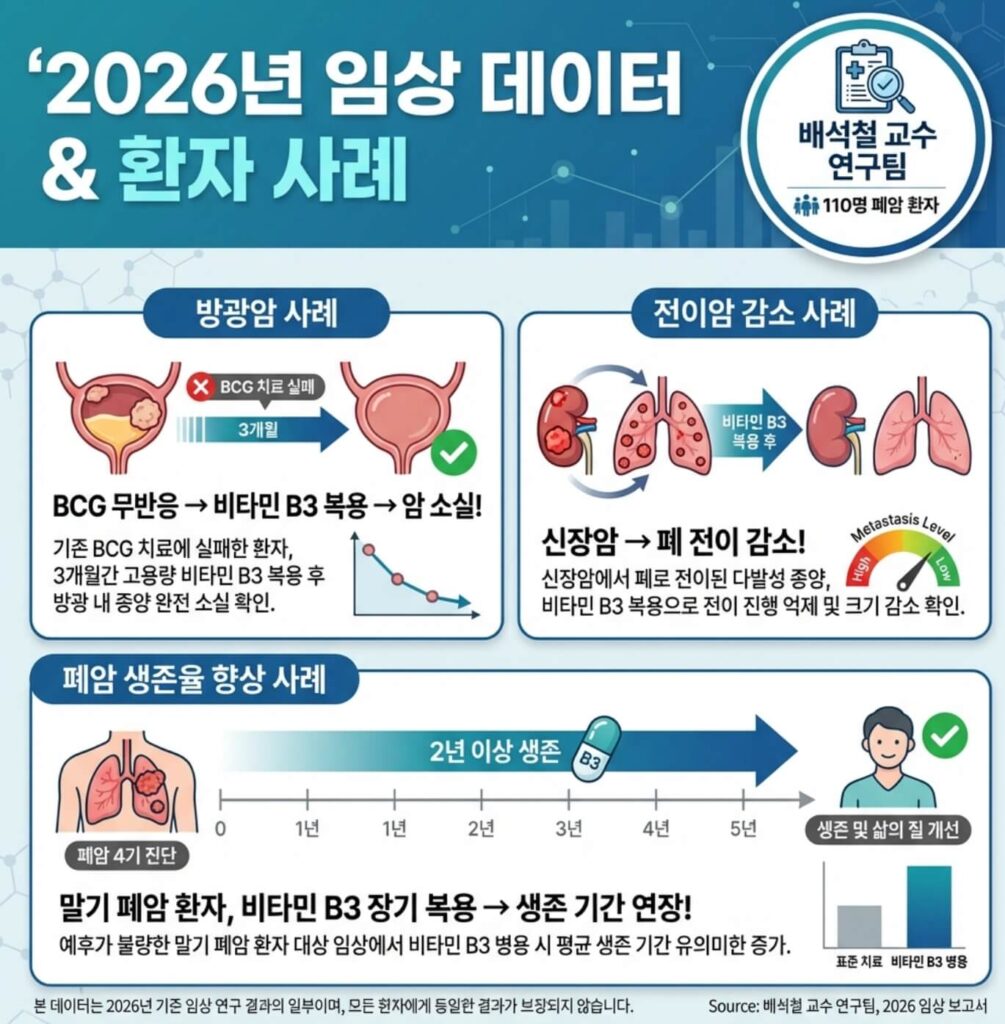 • 방광암 사례: 기존 항암제(BCG 등)에 반응이 없던 환자가 비타민 B3 복용 3개월 만에 암 소실 판정.