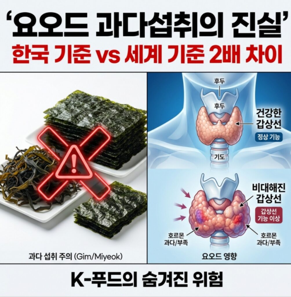 상명대 강상욱 교수를 비롯한 전문가들이 지속적으로 경고해온 해조류의 갑상선암 원인 요오드 위험성은 주요 언론에서 거의 다뤄지지 않습니다. 김과 미역이 K-푸드의 대표 수출품목이자 국가 이미지와 직결되는 산업이기 때문입니다.