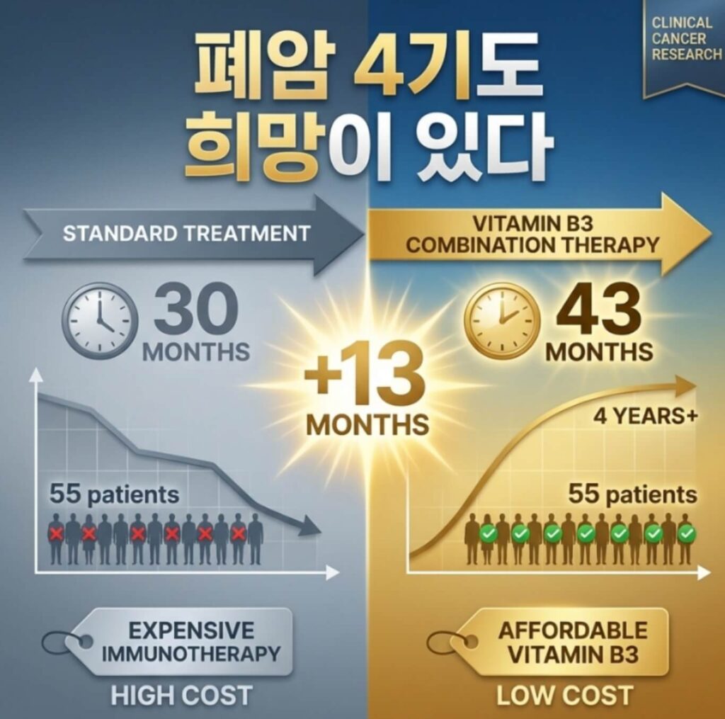 비타민B3 폐암 임상시험 결과가 드디어 공개되었습니다. 2015년부터 8년간 진행된 110명 대규모 연구에서 폐암 4기 환자의 생존기간이 30개월 → 43개월 (13개월 연장)되었습니다.