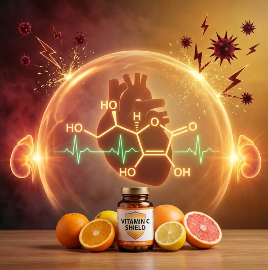비타민C는 심장 근육을 보호하는 강력한 항산화 방패입니다. 이 방패가 사라지면 활성산소가 심장 세포를 직접 공격하여 세포가 스스로 파괴되는 ‘세포 자살(Apoptosis)‘ 현상이 일어납니다. 이것이 바로 혈관 이상 없이 발생하는 비타민C 돌연사의 실체입니다.